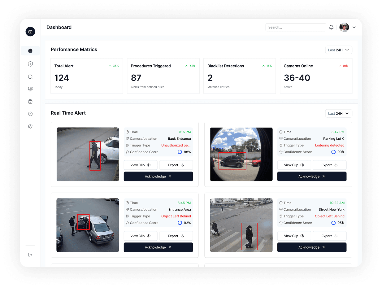 AI-Powered Video Surveillance Operator. Analyzes thousands of video feeds in real-time, detects critical events, and alerts operators with actionable insights.